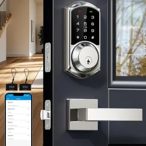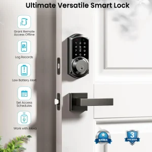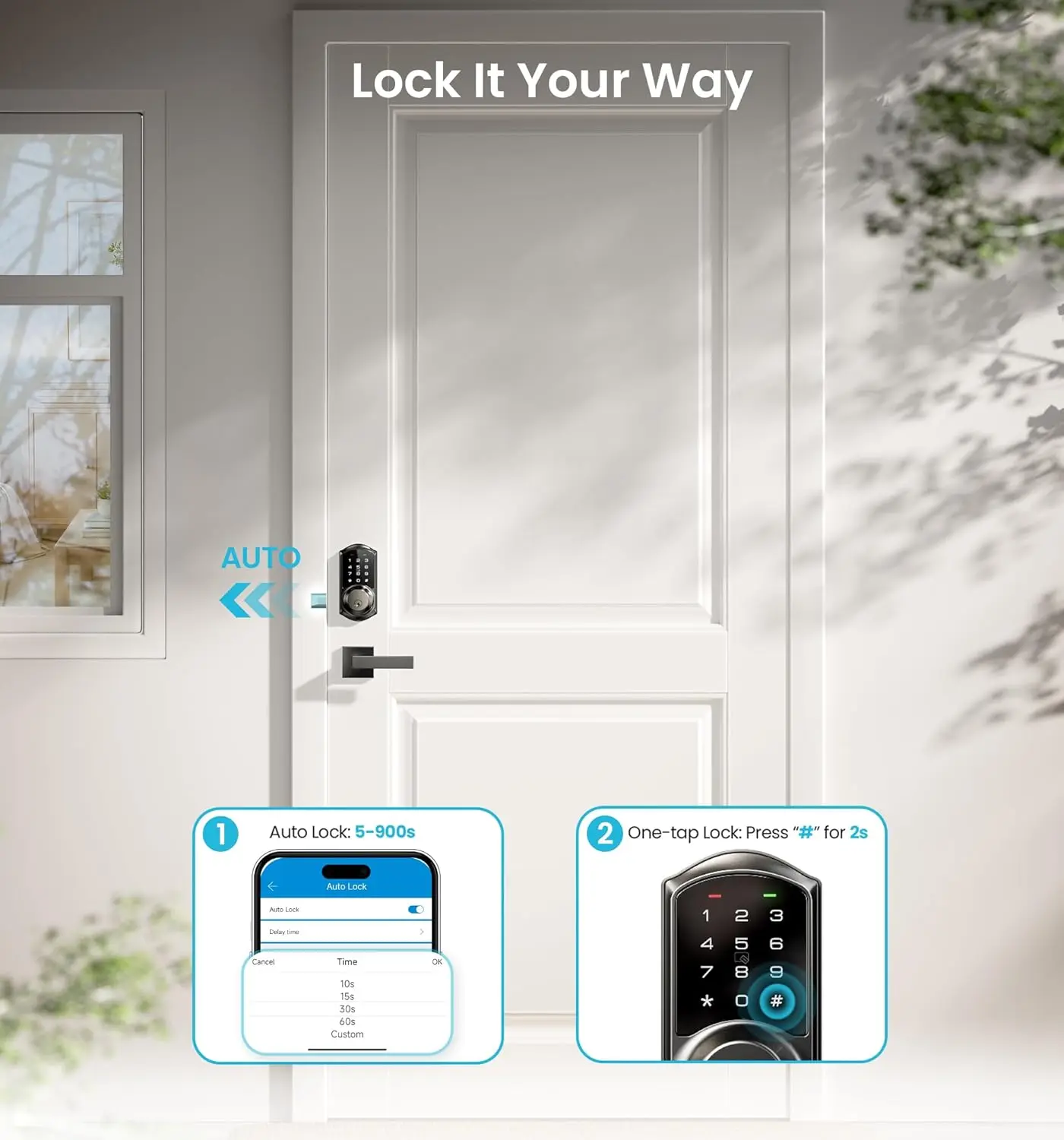 - Smart Door Lock with Handle: Access your smart deadbolt lock via App + Web portal + 2 Cards + Code + eKey sharing + Authorized Admin + 2 Mechanical key + Thumb turn. AUTO lock in 5 – 900 s and simply press “#” on the keypad for 2 s to activate one-touch locking. Compatible with Apple Watch